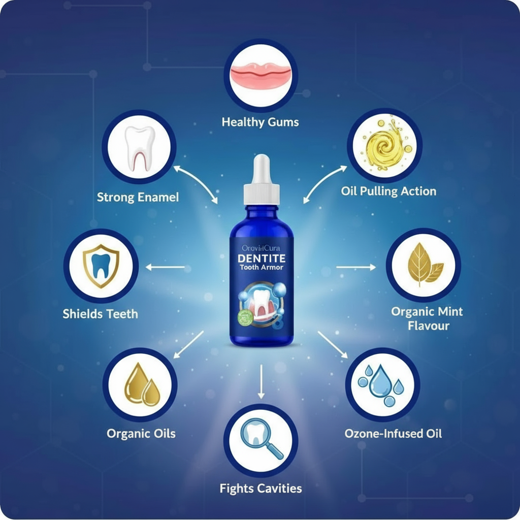 Experience the next generation of dental wellness with OroviaCura Dentite Tooth Armor — a powerful, all-natural formula that promotes lasting freshness, brighter teeth, and a confident smile.